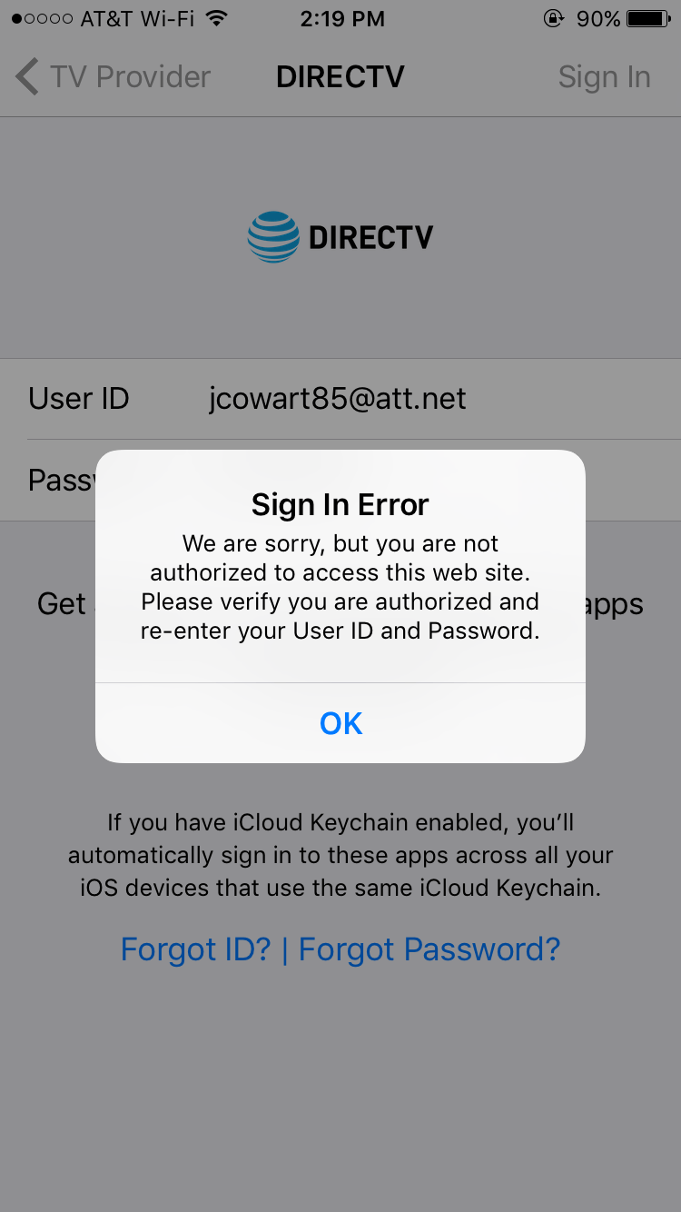 Directv Sign In Error Iphone - · go to the settings app, then tap tv .. It still hasn't been fixed. · go to the settings app, then tap tv . Keep receiving a 201 error. If you're a directv subscriber and trying to watch tv shows on ios/ipad os/tv os, you may have encountered an error when trying to log into . Download the directv app, a companion to your directv service,.